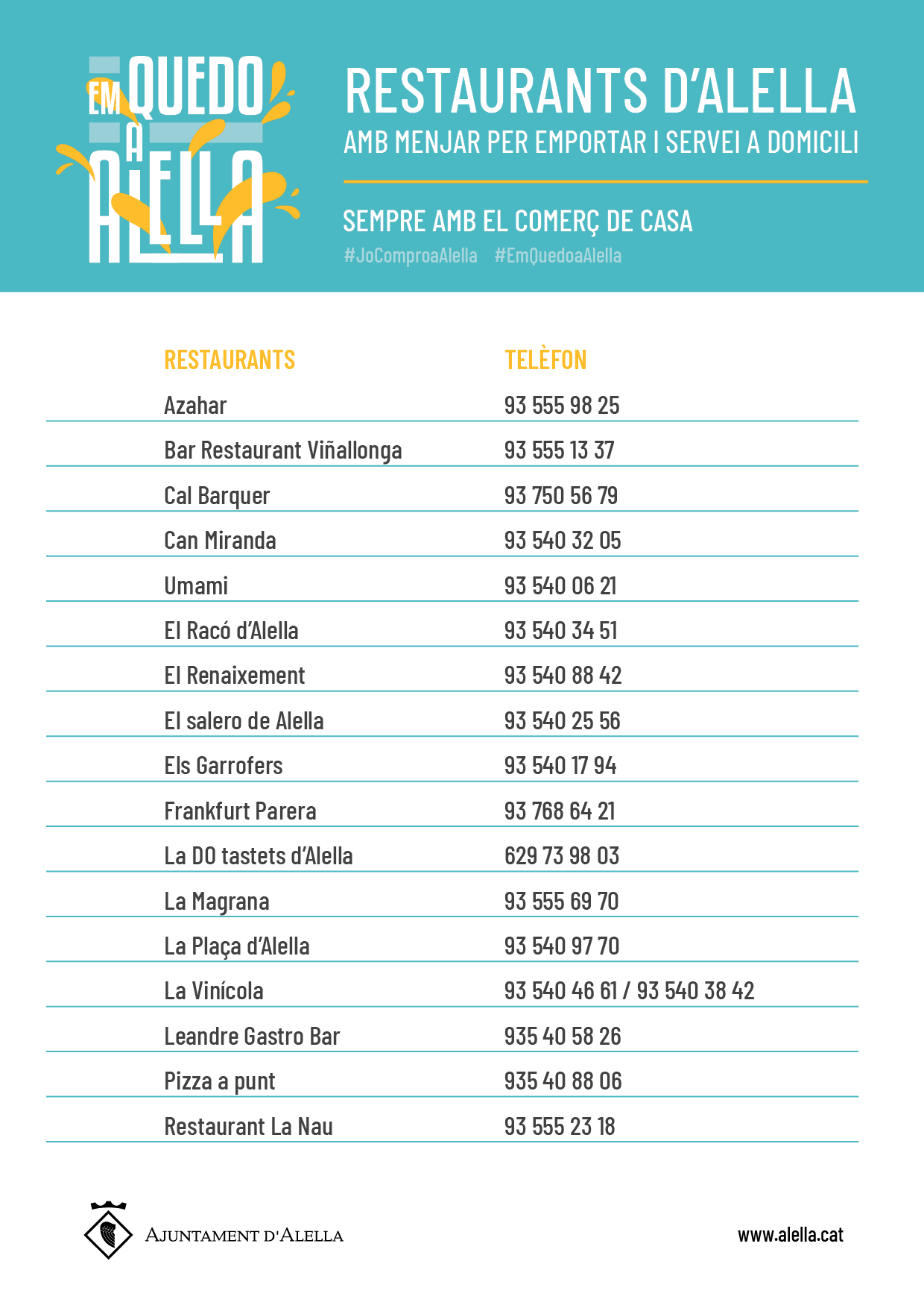 D'altra banda, dins de les mesures de suport a la restauració, l'Ajuntament i el Consorci de Promoció Enoturística del Territori DO Alella han organitzat una jornada de formació, per aquest dimecres 18 d'octubre, adreçada als restaurants i botigues de vins per ajudar-los a millorar la gestió i la carta de vins dels seus establiments. La sessió està dirigida pel sommelier Joan Lluis Gomez. Els establiments interessats a participar han d'emplenar aquest formulari.