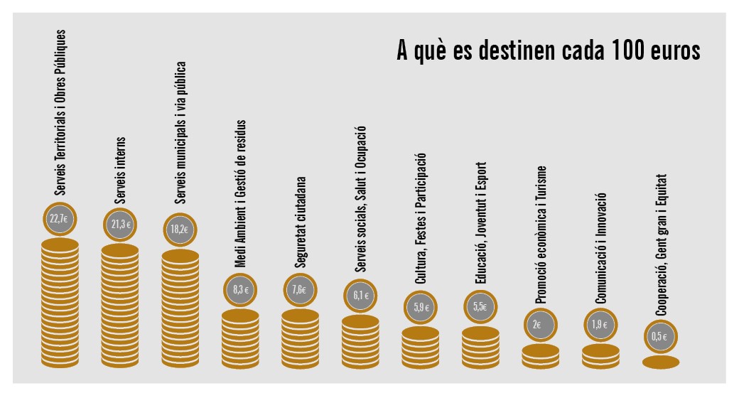 S'incrementa un 5% la partida de personal per la incorporació de nous operaris contractats amb plans d'ocupació i per l'increment previst a les retribucions del personal del sector públic. També puja més d'un 4% la depesa de béns i serveis, a conseqüència dels efectes de la inflació i per l'increment previst del 26% en el servei de neteja d'edificis. El manteniment del municipi i la prestació de serveis a la ciutadania suposa una despesa de 7,8 milions, més del 40% del pressupost municipal. Pel que fa al personal, suposa un 27% de les despeses.