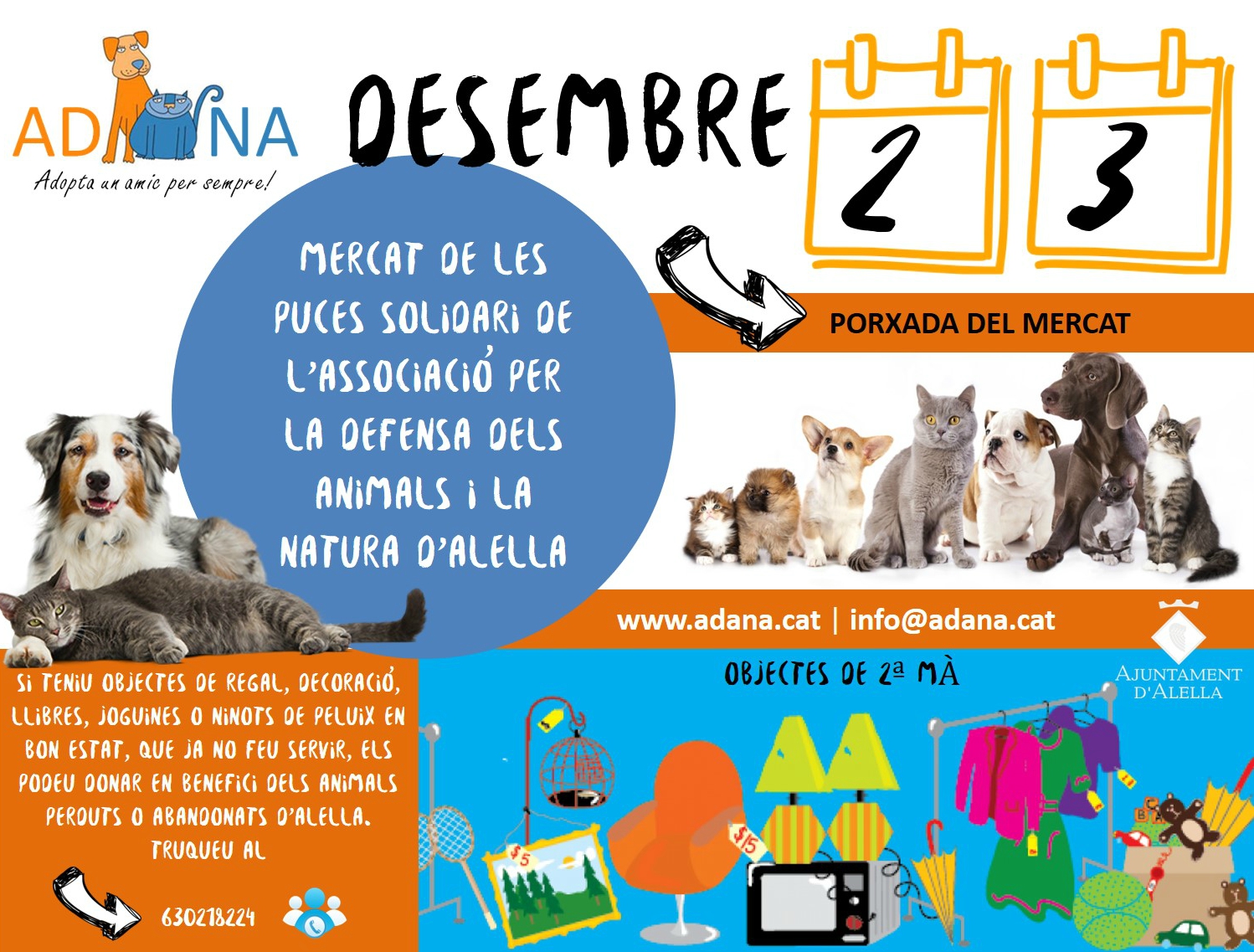 Mercat de puces solidari de l'Associació per la Defensa dels Animals i la Natura d'Alella (ADANA). Si teniu objectes de regal, decoració, llibres, joguines o ninots de peluix en bon estat que ja no feu servir, els podeu donar en benefici dels animals perduts o abandonats a Alella. Més informació