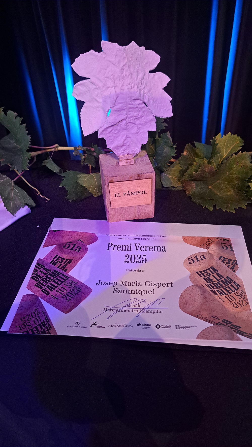 Enguany el premi és obra de Joan Pradell, un jove artista alellenc. Es tracta d'una escultura de ceràmica blanca que reprodueix un pàmpol de les vinyes d'Alella.