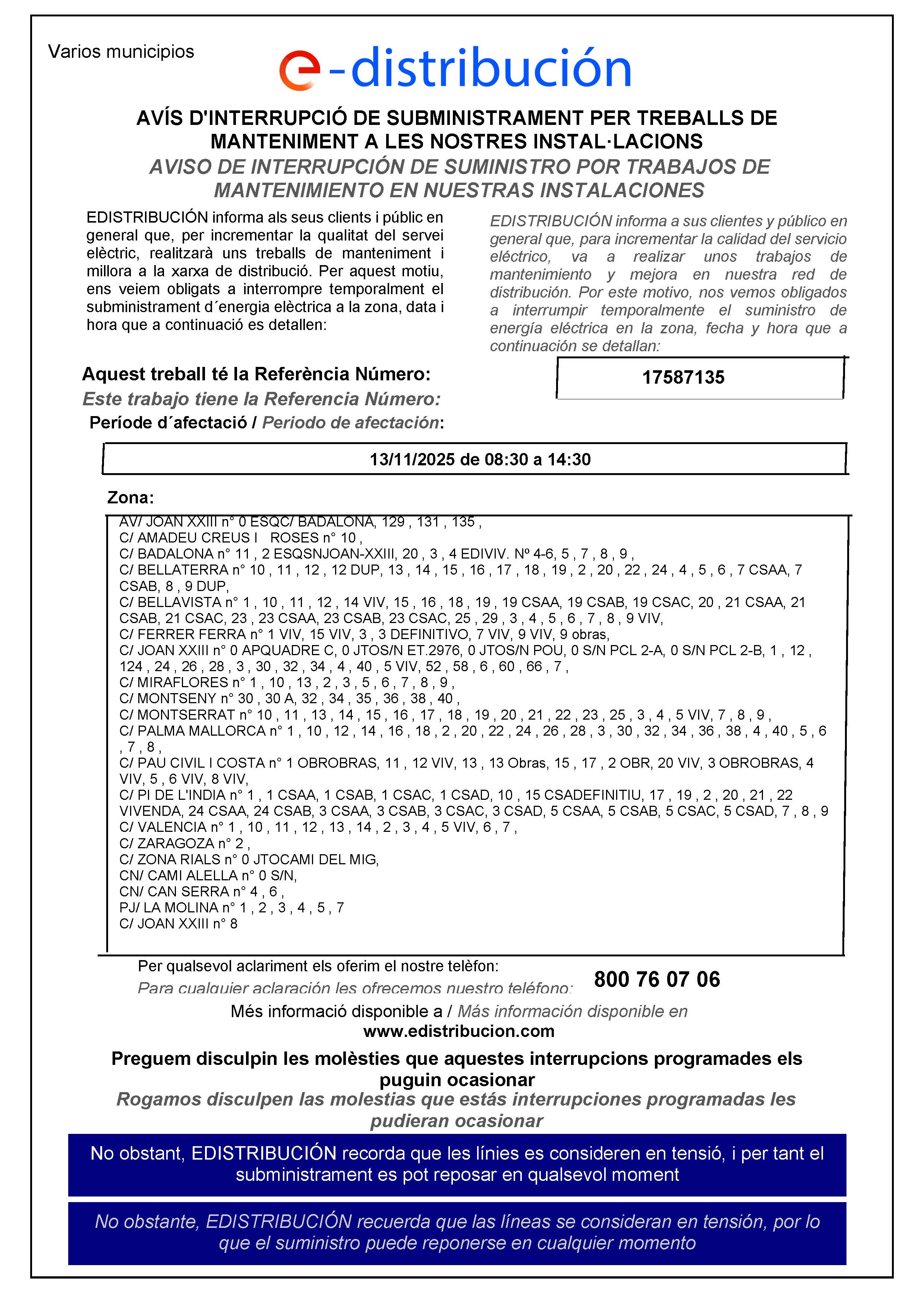 Edistribución informa que té previst la realització de treballs de manteniment de la xarxa de distribució el proper dijous 13 de novembre, entre les 8 i les 14h, que afectarà al barri d'Ibars Meia.