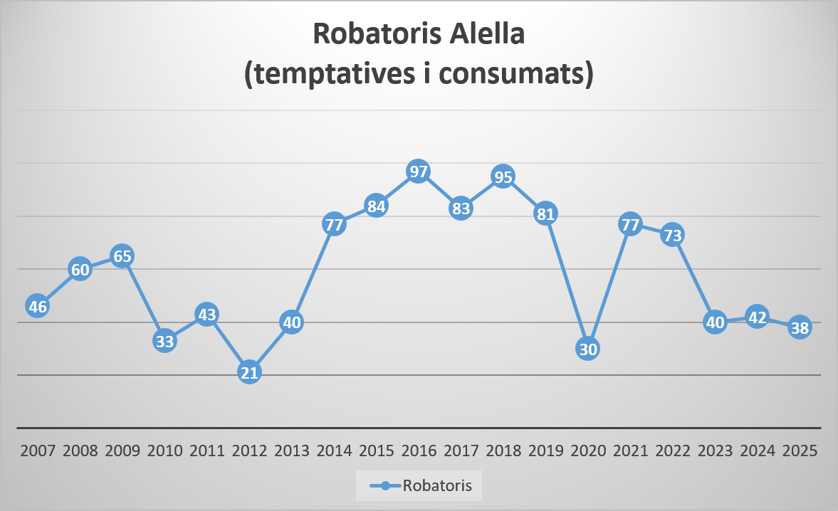 Estadístiques any 2026La informació sobre el nombre de robatoris s'actualitza mensualment, segons la disponibilitat de les dades facilitades pel cos de Mossos d'Esquadra, i es comptabilitzen els robatoris consumats i temptatives que hagin estat denunciats.