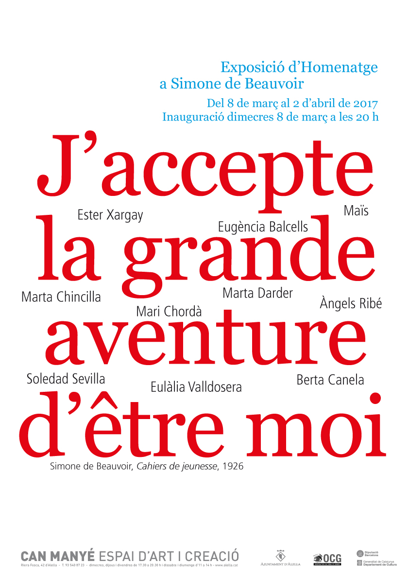 A Can Manyé es podrà visitar del 8 de març al 2 d'abril l'exposició "J'accepte la grande aventure d’être moi", en el què deu dones artistes —Eugènia Balcells, Marta Chinchilla, Mari Chordà, Marta Darder, Maïs Jorba, Àngels Ribé, Soledad Sevilla, Eulàlia Valldosera, Ester Xargay i Berta Llobet— mostren un treball representatiu del seu univers individual, amb un denominador comú: cadascuna d'elles s'enfronta a l'aventura de ser ella mateixa, tal i com va fer Beuavoir. Maïs Jorba i Marta Darder són les comissàries d'aquesta exposició que es va inaugurar l'any passat amb motiu del 30è aniversari de la mort de l'escriptora, organitzada per l'Observatori Cultural de Gènere.
