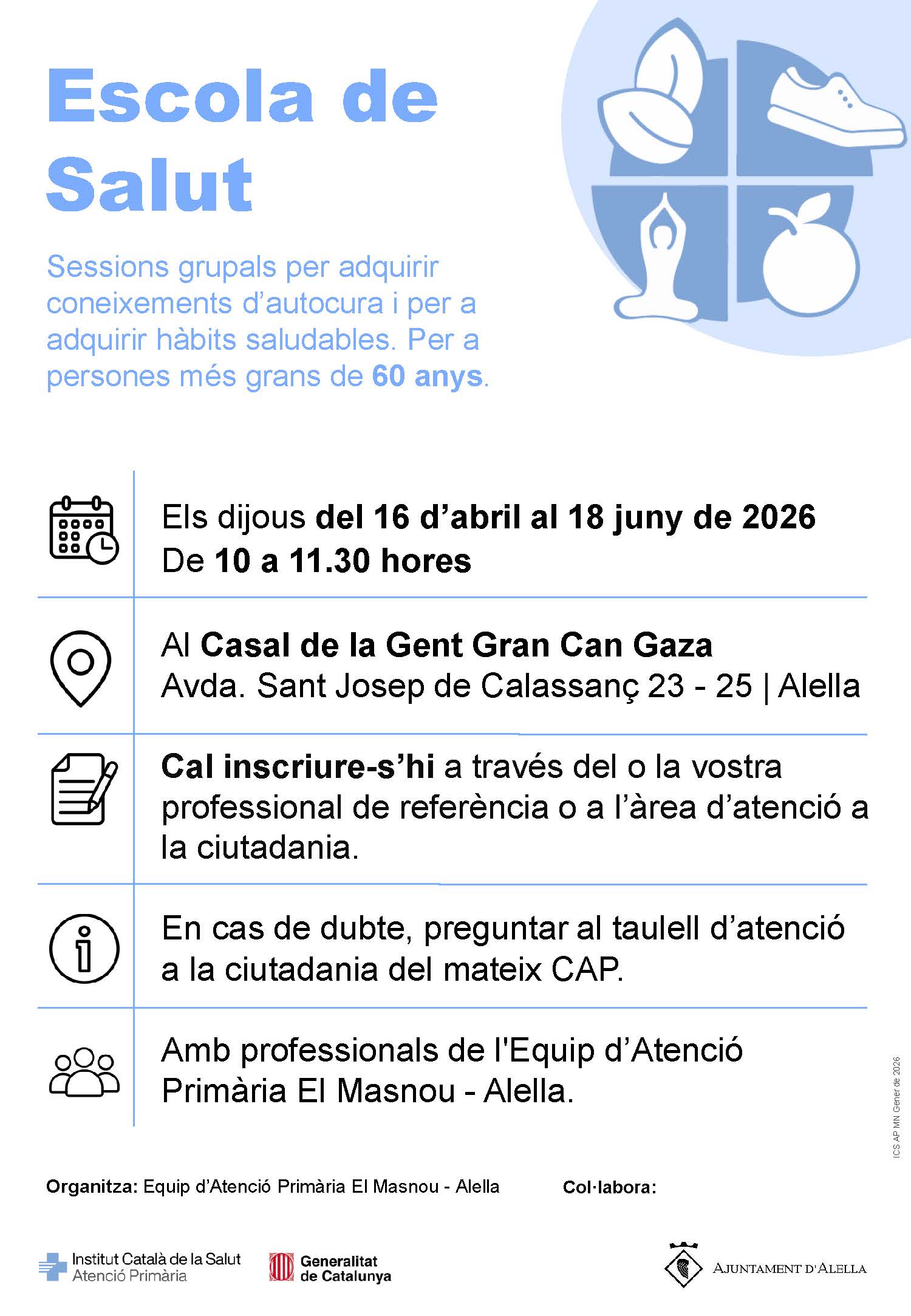Sessions grupals per adquirir coneixements d ’autocura i per a adquirir hàbits saludables. Per a persones més grans de 60 anys